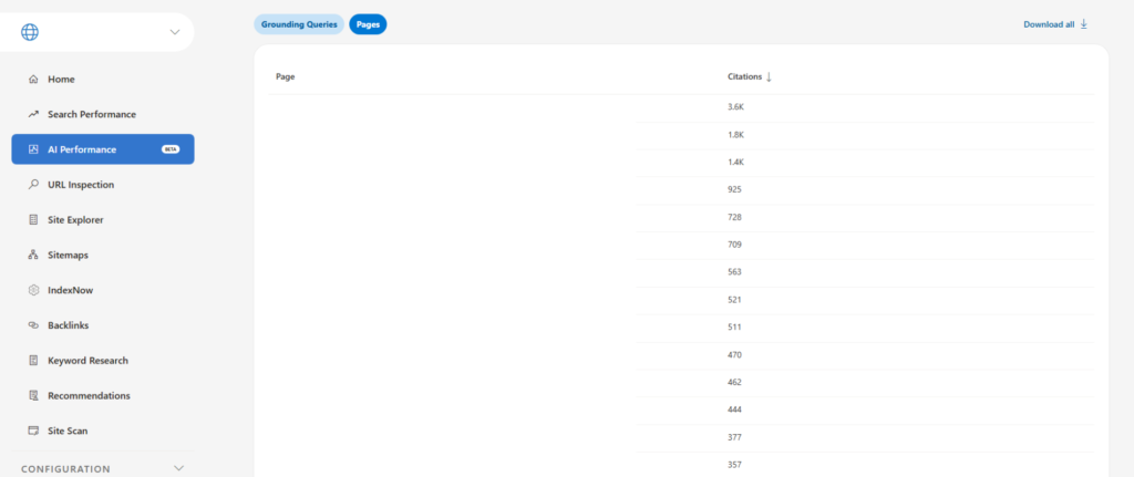 במסך הראשי של הדוח ניתן לראות גרף מגמה המציג את סך האזכורים (Total Citations) ואת ממוצע העמודים המצוטטים (Avg. Cited Pages). כפי שניתן לראות בצילום המסך, המערכת מציגה נתון מרשים של 45.4K ציטוטים לאורך התקופה שנבחרה (בדוגמה זו, 3 חודשים). הגרף מאפשר לזהות מגמות – האם התוכן שלכם הופך למקור אמין יותר עבור ה-Copilot לאורך זמן? והאם יש ימים ספציפיים שבהם התוכן שלכם זוכה לחשיפה מוגברת?